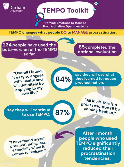 The development of the TEMPO was achieved through a process of co-produced research involving people with lived experience of procrastination and/or ADHD, and included a combination of consultations, focus groups, and user surveys. Development started in 2024 and was supported by the Durham University Research Impact Fund (RIF). The TEMPO toolkit was designed in collaboration with the Research Retold team.